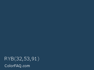 RYB 32,53,91 Color is a dark blue color and the nearest color is Cello #1e385b. Hex code #20415b and RGB value is rgb(32,65,91). In RGB color space, this color is composed of 13% red, 25% green, 36% blue, In CMYK color space, this color is composed of 65% cyan, 29% magenta, 0% yellow , 64% black , In HSL color space, this color has a hue angle of 206° , 48% saturation and 24% lightness.