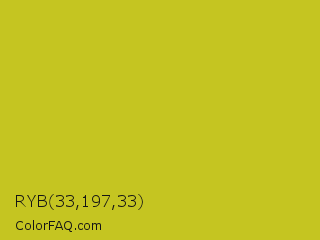 RYB 33,197,33 Color is a normal yellow color and the nearest color is Key Lime Pie #bfc921. Hex code #c5c521 and RGB value is rgb(197,197,33). In RGB color space, this color is composed of 77% red, 77% green, 13% blue, In CMYK color space, this color is composed of 0% cyan, 0% magenta, 83% yellow , 23% black , In HSL color space, this color has a hue angle of 60° , 71% saturation and 45% lightness.