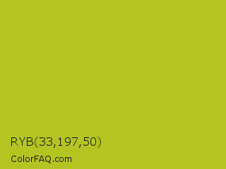 RYB 33,197,50 Color is a normal yellow color and the nearest color is Acid Green #b0bf1a. Hex code #b4c521 and RGB value is rgb(180,197,33). In RGB color space, this color is composed of 71% red, 77% green, 13% blue, In CMYK color space, this color is composed of 9% cyan, 0% magenta, 83% yellow , 23% black , In HSL color space, this color has a hue angle of 66° , 71% saturation and 45% lightness.