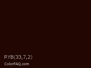 RYB 33,7,2 Color is a almost black red color and the nearest color is Kilamanjaro #240c02. Hex code #210602 and RGB value is rgb(33,6,2). In RGB color space, this color is composed of 13% red, 2% green, 1% blue, In CMYK color space, this color is composed of 0% cyan, 82% magenta, 94% yellow , 87% black , In HSL color space, this color has a hue angle of 8° , 89% saturation and 7% lightness.