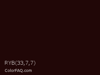 RYB 33,7,7 Color is a almost black red color and the nearest color is Kilamanjaro #240c02. Hex code #210707 and RGB value is rgb(33,7,7). In RGB color space, this color is composed of 13% red, 3% green, 3% blue, In CMYK color space, this color is composed of 0% cyan, 79% magenta, 79% yellow , 87% black , In HSL color space, this color has a hue angle of 0° , 65% saturation and 8% lightness.