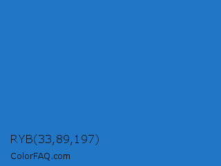 RYB 33,89,197 Color is a normal blue color and the nearest color is Bright Navy Blue #1974d2. Hex code #2176c5 and RGB value is rgb(33,118,197). In RGB color space, this color is composed of 13% red, 46% green, 77% blue, In CMYK color space, this color is composed of 83% cyan, 40% magenta, 0% yellow , 23% black , In HSL color space, this color has a hue angle of 209° , 71% saturation and 45% lightness.