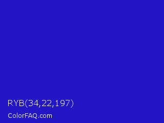 RYB 34,22,197 Color is a normal indigo color and the nearest color is Interdimensional Blue #360ccc. Hex code #2216c5 and RGB value is rgb(34,22,197). In RGB color space, this color is composed of 13% red, 9% green, 77% blue, In CMYK color space, this color is composed of 83% cyan, 89% magenta, 0% yellow , 23% black , In HSL color space, this color has a hue angle of 244° , 80% saturation and 43% lightness.