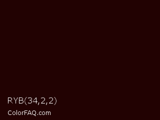 RYB 34,2,2 Color is a almost black red color and the nearest color is Sepia Black #2b0202. Hex code #220202 and RGB value is rgb(34,2,2). In RGB color space, this color is composed of 13% red, 1% green, 1% blue, In CMYK color space, this color is composed of 0% cyan, 94% magenta, 94% yellow , 87% black , In HSL color space, this color has a hue angle of 0° , 89% saturation and 7% lightness.