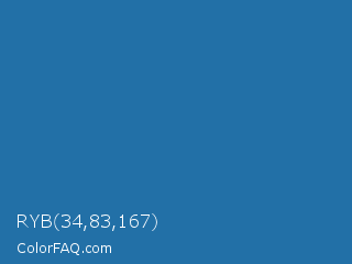 RYB 34,83,167 Color is a normal blue color and the nearest color is Matisse #1b659d. Hex code #2270a7 and RGB value is rgb(34,112,167). In RGB color space, this color is composed of 13% red, 44% green, 65% blue, In CMYK color space, this color is composed of 80% cyan, 33% magenta, 0% yellow , 35% black , In HSL color space, this color has a hue angle of 205° , 66% saturation and 39% lightness.
