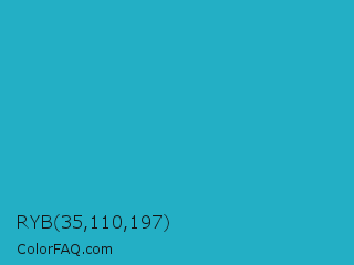 RYB 35,110,197 Color is a normal cyan color and the nearest color is Ball Blue #21abcd. Hex code #23afc5 and RGB value is rgb(35,175,197). In RGB color space, this color is composed of 14% red, 69% green, 77% blue, In CMYK color space, this color is composed of 82% cyan, 11% magenta, 0% yellow , 23% black , In HSL color space, this color has a hue angle of 188° , 70% saturation and 45% lightness.