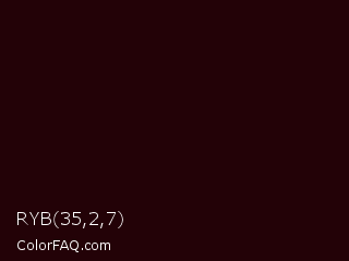 RYB 35,2,7 Color is a almost black red color and the nearest color is Sepia Black #2b0202. Hex code #230207 and RGB value is rgb(35,2,7). In RGB color space, this color is composed of 14% red, 1% green, 3% blue, In CMYK color space, this color is composed of 0% cyan, 94% magenta, 80% yellow , 86% black , In HSL color space, this color has a hue angle of 351° , 89% saturation and 7% lightness.