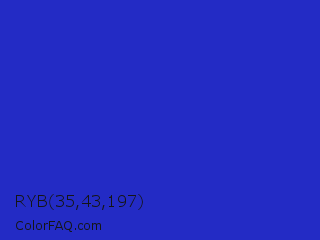 RYB 35,43,197 Color is a normal blue color and the nearest color is Persian Blue #1c39bb. Hex code #232bc5 and RGB value is rgb(35,43,197). In RGB color space, this color is composed of 14% red, 17% green, 77% blue, In CMYK color space, this color is composed of 82% cyan, 78% magenta, 0% yellow , 23% black , In HSL color space, this color has a hue angle of 237° , 70% saturation and 45% lightness.