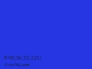 RYB 36,53,225 Color is a normal blue color and the nearest color is Palatinate Blue #273be2. Hex code #2437e1 and RGB value is rgb(36,55,225). In RGB color space, this color is composed of 14% red, 22% green, 88% blue, In CMYK color space, this color is composed of 84% cyan, 76% magenta, 0% yellow , 12% black , In HSL color space, this color has a hue angle of 234° , 76% saturation and 51% lightness.