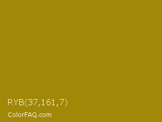 RYB 37,161,7 Color is a normal yellow color and the nearest color is Dark Yellow #9b870c. Hex code #a18807 and RGB value is rgb(161,136,7). In RGB color space, this color is composed of 63% red, 53% green, 3% blue, In CMYK color space, this color is composed of 0% cyan, 16% magenta, 96% yellow , 37% black , In HSL color space, this color has a hue angle of 50° , 92% saturation and 33% lightness.