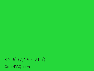 RYB 37,197,216 Color is a normal green color and the nearest color is Lime Green #32cd32. Hex code #25d83a and RGB value is rgb(37,216,58). In RGB color space, this color is composed of 15% red, 85% green, 23% blue, In CMYK color space, this color is composed of 83% cyan, 0% magenta, 73% yellow , 15% black , In HSL color space, this color has a hue angle of 127° , 71% saturation and 50% lightness.