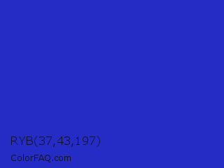 RYB 37,43,197 Color is a normal blue color and the nearest color is Persian Blue #1c39bb. Hex code #252bc5 and RGB value is rgb(37,43,197). In RGB color space, this color is composed of 15% red, 17% green, 77% blue, In CMYK color space, this color is composed of 81% cyan, 78% magenta, 0% yellow , 23% black , In HSL color space, this color has a hue angle of 238° , 68% saturation and 46% lightness.