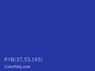 RYB 37,53,165 Color is a normal blue color and the nearest color is Governor Bay #2f3cb3. Hex code #2537a5 and RGB value is rgb(37,55,165). In RGB color space, this color is composed of 15% red, 22% green, 65% blue, In CMYK color space, this color is composed of 78% cyan, 67% magenta, 0% yellow , 35% black , In HSL color space, this color has a hue angle of 232° , 63% saturation and 40% lightness.
