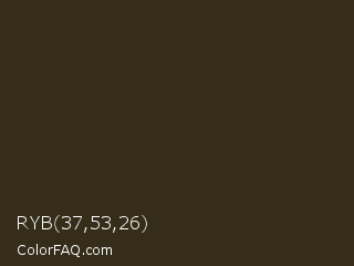 RYB 37,53,26 Color is a very dark orange color and the nearest color is Birch #373021. Hex code #352d1a and RGB value is rgb(53,45,26). In RGB color space, this color is composed of 21% red, 18% green, 10% blue, In CMYK color space, this color is composed of 0% cyan, 15% magenta, 51% yellow , 79% black , In HSL color space, this color has a hue angle of 42° , 34% saturation and 15% lightness.