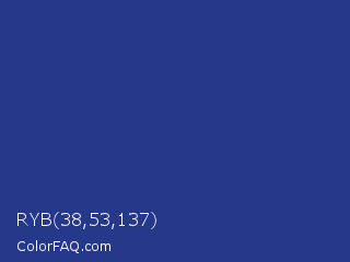 RYB 38,53,137 Color is a normal blue color and the nearest color is Bay Of Many #273a81. Hex code #263889 and RGB value is rgb(38,56,137). In RGB color space, this color is composed of 15% red, 22% green, 54% blue, In CMYK color space, this color is composed of 72% cyan, 59% magenta, 0% yellow , 46% black , In HSL color space, this color has a hue angle of 229° , 57% saturation and 34% lightness.