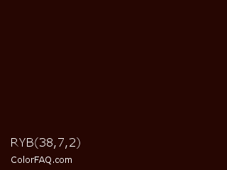 RYB 38,7,2 Color is a almost black red color and the nearest color is Kilamanjaro #240c02. Hex code #260602 and RGB value is rgb(38,6,2). In RGB color space, this color is composed of 15% red, 2% green, 1% blue, In CMYK color space, this color is composed of 0% cyan, 84% magenta, 95% yellow , 85% black , In HSL color space, this color has a hue angle of 7° , 90% saturation and 8% lightness.