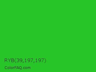 RYB 39,197,197 Color is a normal green color and the nearest color is Lime Green #32cd32. Hex code #27c527 and RGB value is rgb(39,197,39). In RGB color space, this color is composed of 15% red, 77% green, 15% blue, In CMYK color space, this color is composed of 80% cyan, 0% magenta, 80% yellow , 23% black , In HSL color space, this color has a hue angle of 120° , 67% saturation and 46% lightness.