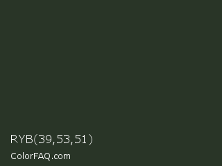RYB 39,53,51 Color is a very dark green color and the nearest color is Heavy Metal #2b3228. Hex code #293527 and RGB value is rgb(41,53,39). In RGB color space, this color is composed of 16% red, 21% green, 15% blue, In CMYK color space, this color is composed of 23% cyan, 0% magenta, 26% yellow , 79% black , In HSL color space, this color has a hue angle of 111° , 15% saturation and 18% lightness.