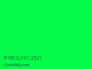 RYB 3,197,252 Color is a normal green color and the nearest color is Malachite #0bda51. Hex code #03fc4a and RGB value is rgb(3,252,74). In RGB color space, this color is composed of 1% red, 99% green, 29% blue, In CMYK color space, this color is composed of 99% cyan, 0% magenta, 71% yellow , 1% black , In HSL color space, this color has a hue angle of 137° , 98% saturation and 50% lightness.