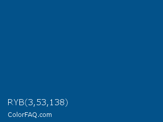 RYB 3,53,138 Color is a dark blue color and the nearest color is Venice Blue #055989. Hex code #03528a and RGB value is rgb(3,82,138). In RGB color space, this color is composed of 1% red, 32% green, 54% blue, In CMYK color space, this color is composed of 98% cyan, 41% magenta, 0% yellow , 46% black , In HSL color space, this color has a hue angle of 205° , 96% saturation and 28% lightness.
