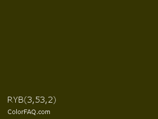 RYB 3,53,2 Color is a very dark yellow color and the nearest color is Madras #3f3002. Hex code #353402 and RGB value is rgb(53,52,2). In RGB color space, this color is composed of 21% red, 20% green, 1% blue, In CMYK color space, this color is composed of 0% cyan, 2% magenta, 96% yellow , 79% black , In HSL color space, this color has a hue angle of 59° , 93% saturation and 11% lightness.