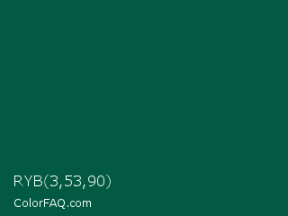 RYB 3,53,90 Color is a very dark cyan color and the nearest color is Sacramento State Green #00563f. Hex code #035a43 and RGB value is rgb(3,90,67). In RGB color space, this color is composed of 1% red, 35% green, 26% blue, In CMYK color space, this color is composed of 97% cyan, 0% magenta, 26% yellow , 65% black , In HSL color space, this color has a hue angle of 164° , 94% saturation and 18% lightness.
