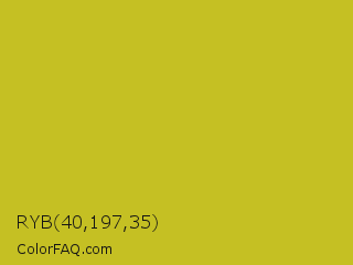 RYB 40,197,35 Color is a normal yellow color and the nearest color is Key Lime Pie #bfc921. Hex code #c5c023 and RGB value is rgb(197,192,35). In RGB color space, this color is composed of 77% red, 75% green, 14% blue, In CMYK color space, this color is composed of 0% cyan, 3% magenta, 82% yellow , 23% black , In HSL color space, this color has a hue angle of 58° , 70% saturation and 45% lightness.