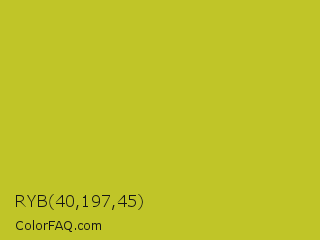 RYB 40,197,45 Color is a normal yellow color and the nearest color is Key Lime Pie #bfc921. Hex code #c0c528 and RGB value is rgb(192,197,40). In RGB color space, this color is composed of 75% red, 77% green, 16% blue, In CMYK color space, this color is composed of 3% cyan, 0% magenta, 80% yellow , 23% black , In HSL color space, this color has a hue angle of 62° , 66% saturation and 46% lightness.