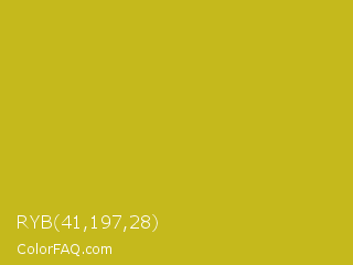 RYB 41,197,28 Color is a normal yellow color and the nearest color is Key Lime Pie #bfc921. Hex code #c5b91c and RGB value is rgb(197,185,28). In RGB color space, this color is composed of 77% red, 73% green, 11% blue, In CMYK color space, this color is composed of 0% cyan, 6% magenta, 86% yellow , 23% black , In HSL color space, this color has a hue angle of 56° , 75% saturation and 44% lightness.