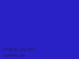 RYB 41,33,197 Color is a normal indigo color and the nearest color is Interdimensional Blue #360ccc. Hex code #2921c5 and RGB value is rgb(41,33,197). In RGB color space, this color is composed of 16% red, 13% green, 77% blue, In CMYK color space, this color is composed of 79% cyan, 83% magenta, 0% yellow , 23% black , In HSL color space, this color has a hue angle of 243° , 71% saturation and 45% lightness.