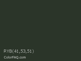 RYB 41,53,51 Color is a very dark green color and the nearest color is Heavy Metal #2b3228. Hex code #2b3529 and RGB value is rgb(43,53,41). In RGB color space, this color is composed of 17% red, 21% green, 16% blue, In CMYK color space, this color is composed of 19% cyan, 0% magenta, 23% yellow , 79% black , In HSL color space, this color has a hue angle of 110° , 13% saturation and 18% lightness.