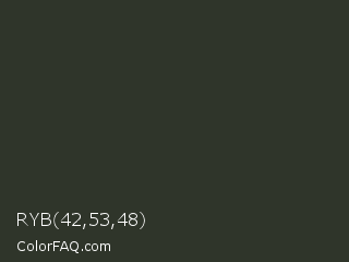 RYB 42,53,48 Color is a very dark green color and the nearest color is Heavy Metal #2b3228. Hex code #2f352a and RGB value is rgb(47,53,42). In RGB color space, this color is composed of 18% red, 21% green, 16% blue, In CMYK color space, this color is composed of 11% cyan, 0% magenta, 21% yellow , 79% black , In HSL color space, this color has a hue angle of 93° , 12% saturation and 19% lightness.