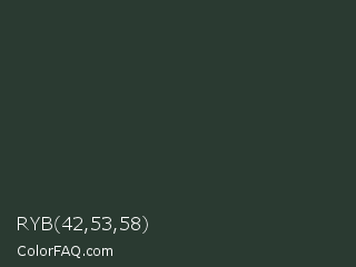 RYB 42,53,58 Color is a very dark green color and the nearest color is Outer Space Crayola #2d383a. Hex code #2a3a31 and RGB value is rgb(42,58,49). In RGB color space, this color is composed of 16% red, 23% green, 19% blue, In CMYK color space, this color is composed of 28% cyan, 0% magenta, 16% yellow , 77% black , In HSL color space, this color has a hue angle of 146° , 16% saturation and 20% lightness.