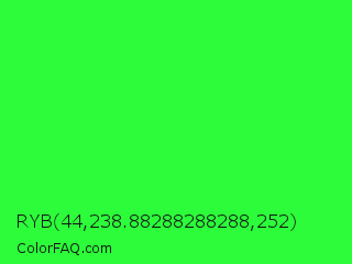RYB 44,238.88288288288,252 Color is a normal green color and the nearest color is Neon Green #39ff14. Hex code #2cfc3a and RGB value is rgb(44,252,58). In RGB color space, this color is composed of 17% red, 99% green, 23% blue, In CMYK color space, this color is composed of 83% cyan, 0% magenta, 77% yellow , 1% black , In HSL color space, this color has a hue angle of 124° , 97% saturation and 58% lightness.