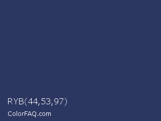 RYB 44,53,97 Color is a dark blue color and the nearest color is Rhino #2e3f62. Hex code #2c3761 and RGB value is rgb(44,55,97). In RGB color space, this color is composed of 17% red, 22% green, 38% blue, In CMYK color space, this color is composed of 55% cyan, 43% magenta, 0% yellow , 62% black , In HSL color space, this color has a hue angle of 228° , 38% saturation and 28% lightness.