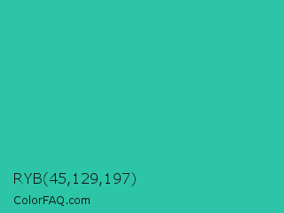RYB 45,129,197 Color is a normal cyan color and the nearest color is Shamrock #33cc99. Hex code #2dc5a8 and RGB value is rgb(45,197,168). In RGB color space, this color is composed of 18% red, 77% green, 66% blue, In CMYK color space, this color is composed of 77% cyan, 0% magenta, 15% yellow , 23% black , In HSL color space, this color has a hue angle of 169° , 63% saturation and 47% lightness.