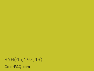 RYB 45,197,43 Color is a normal yellow color and the nearest color is Key Lime Pie #bfc921. Hex code #c5c32b and RGB value is rgb(197,195,43). In RGB color space, this color is composed of 77% red, 76% green, 17% blue, In CMYK color space, this color is composed of 0% cyan, 1% magenta, 78% yellow , 23% black , In HSL color space, this color has a hue angle of 59° , 64% saturation and 47% lightness.