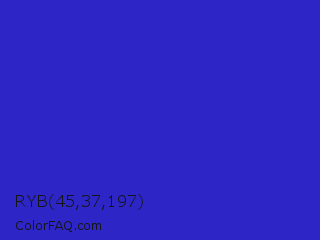 RYB 45,37,197 Color is a normal indigo color and the nearest color is Interdimensional Blue #360ccc. Hex code #2d25c5 and RGB value is rgb(45,37,197). In RGB color space, this color is composed of 18% red, 15% green, 77% blue, In CMYK color space, this color is composed of 77% cyan, 81% magenta, 0% yellow , 23% black , In HSL color space, this color has a hue angle of 243° , 68% saturation and 46% lightness.