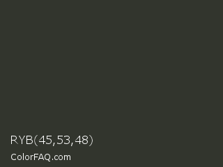 RYB 45,53,48 Color is a very dark green color and the nearest color is Mine Shaft #323232. Hex code #32352d and RGB value is rgb(50,53,45). In RGB color space, this color is composed of 20% red, 21% green, 18% blue, In CMYK color space, this color is composed of 6% cyan, 0% magenta, 15% yellow , 79% black , In HSL color space, this color has a hue angle of 83° , 8% saturation and 19% lightness.
