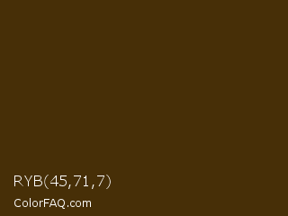 RYB 45,71,7 Color is a very dark orange color and the nearest color is Deep Bronze #4a3004. Hex code #472f07 and RGB value is rgb(71,47,7). In RGB color space, this color is composed of 28% red, 18% green, 3% blue, In CMYK color space, this color is composed of 0% cyan, 34% magenta, 90% yellow , 72% black , In HSL color space, this color has a hue angle of 38° , 82% saturation and 15% lightness.