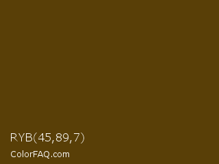 RYB 45,89,7 Color is a very dark orange color and the nearest color is Pineapple #563c0d. Hex code #593f07 and RGB value is rgb(89,63,7). In RGB color space, this color is composed of 35% red, 25% green, 3% blue, In CMYK color space, this color is composed of 0% cyan, 29% magenta, 92% yellow , 65% black , In HSL color space, this color has a hue angle of 41° , 85% saturation and 19% lightness.