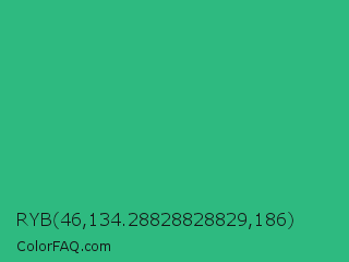 RYB 46,134.28828828829,186 Color is a normal green color and the nearest color is Mountain Meadow #30ba8f. Hex code #2eba80 and RGB value is rgb(46,186,128). In RGB color space, this color is composed of 18% red, 73% green, 50% blue, In CMYK color space, this color is composed of 75% cyan, 0% magenta, 31% yellow , 27% black , In HSL color space, this color has a hue angle of 155° , 60% saturation and 45% lightness.