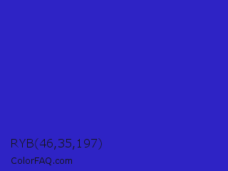 RYB 46,35,197 Color is a normal indigo color and the nearest color is Interdimensional Blue #360ccc. Hex code #2e23c5 and RGB value is rgb(46,35,197). In RGB color space, this color is composed of 18% red, 14% green, 77% blue, In CMYK color space, this color is composed of 77% cyan, 82% magenta, 0% yellow , 23% black , In HSL color space, this color has a hue angle of 244° , 70% saturation and 45% lightness.