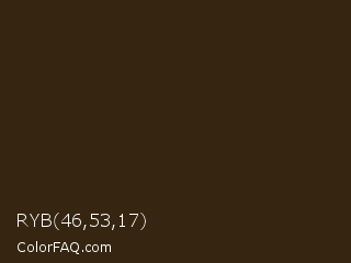 RYB 46,53,17 Color is a very dark orange color and the nearest color is Brown Tumbleweed #37290e. Hex code #352511 and RGB value is rgb(53,37,17). In RGB color space, this color is composed of 21% red, 15% green, 7% blue, In CMYK color space, this color is composed of 0% cyan, 30% magenta, 68% yellow , 79% black , In HSL color space, this color has a hue angle of 33° , 51% saturation and 14% lightness.