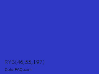 RYB 46,55,197 Color is a normal blue color and the nearest color is Governor Bay #2f3cb3. Hex code #2e38c5 and RGB value is rgb(46,56,197). In RGB color space, this color is composed of 18% red, 22% green, 77% blue, In CMYK color space, this color is composed of 77% cyan, 72% magenta, 0% yellow , 23% black , In HSL color space, this color has a hue angle of 236° , 62% saturation and 48% lightness.