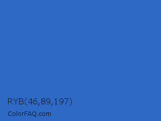 RYB 46,89,197 Color is a normal blue color and the nearest color is Mariner #286acd. Hex code #2e6ac5 and RGB value is rgb(46,106,197). In RGB color space, this color is composed of 18% red, 42% green, 77% blue, In CMYK color space, this color is composed of 77% cyan, 46% magenta, 0% yellow , 23% black , In HSL color space, this color has a hue angle of 216° , 62% saturation and 48% lightness.