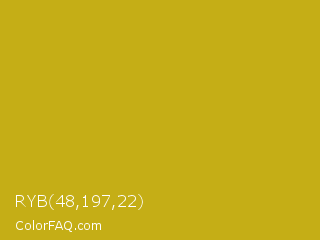 RYB 48,197,22 Color is a normal yellow color and the nearest color is Lemon Curry #cca01d. Hex code #c5ae16 and RGB value is rgb(197,174,22). In RGB color space, this color is composed of 77% red, 68% green, 9% blue, In CMYK color space, this color is composed of 0% cyan, 12% magenta, 89% yellow , 23% black , In HSL color space, this color has a hue angle of 52° , 80% saturation and 43% lightness.