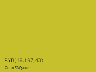 RYB 48,197,43 Color is a normal yellow color and the nearest color is Key Lime Pie #bfc921. Hex code #c5c02b and RGB value is rgb(197,192,43). In RGB color space, this color is composed of 77% red, 75% green, 17% blue, In CMYK color space, this color is composed of 0% cyan, 3% magenta, 78% yellow , 23% black , In HSL color space, this color has a hue angle of 58° , 64% saturation and 47% lightness.