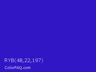 RYB 48,22,197 Color is a normal indigo color and the nearest color is Interdimensional Blue #360ccc. Hex code #3016c5 and RGB value is rgb(48,22,197). In RGB color space, this color is composed of 19% red, 9% green, 77% blue, In CMYK color space, this color is composed of 76% cyan, 89% magenta, 0% yellow , 23% black , In HSL color space, this color has a hue angle of 249° , 80% saturation and 43% lightness.