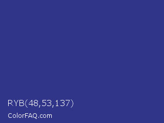 RYB 48,53,137 Color is a normal blue color and the nearest color is Cosmic Cobalt #2e2d88. Hex code #303589 and RGB value is rgb(48,53,137). In RGB color space, this color is composed of 19% red, 21% green, 54% blue, In CMYK color space, this color is composed of 65% cyan, 61% magenta, 0% yellow , 46% black , In HSL color space, this color has a hue angle of 237° , 48% saturation and 36% lightness.